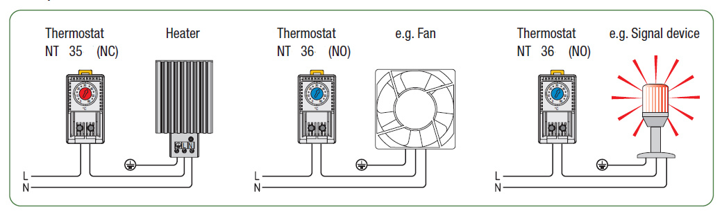 Термостат NT35(NC) предназначен для управления работой обогревателя. При невысокой температуре контакт замкнут (обогреватель работает). При повышении температуры выше уставки контакт размыкается.